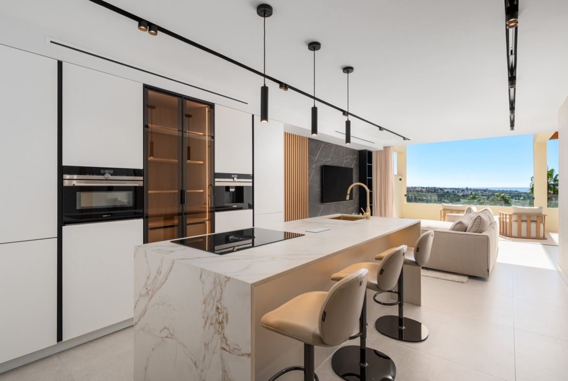 Apartment Jasmine offers an exceptional combination of modern luxury, designer interiors, and breathtaking views in one of Nueva Andalucía’s most prestigious gated communities, Palacetes Los Belvederes.