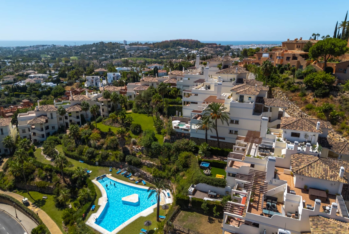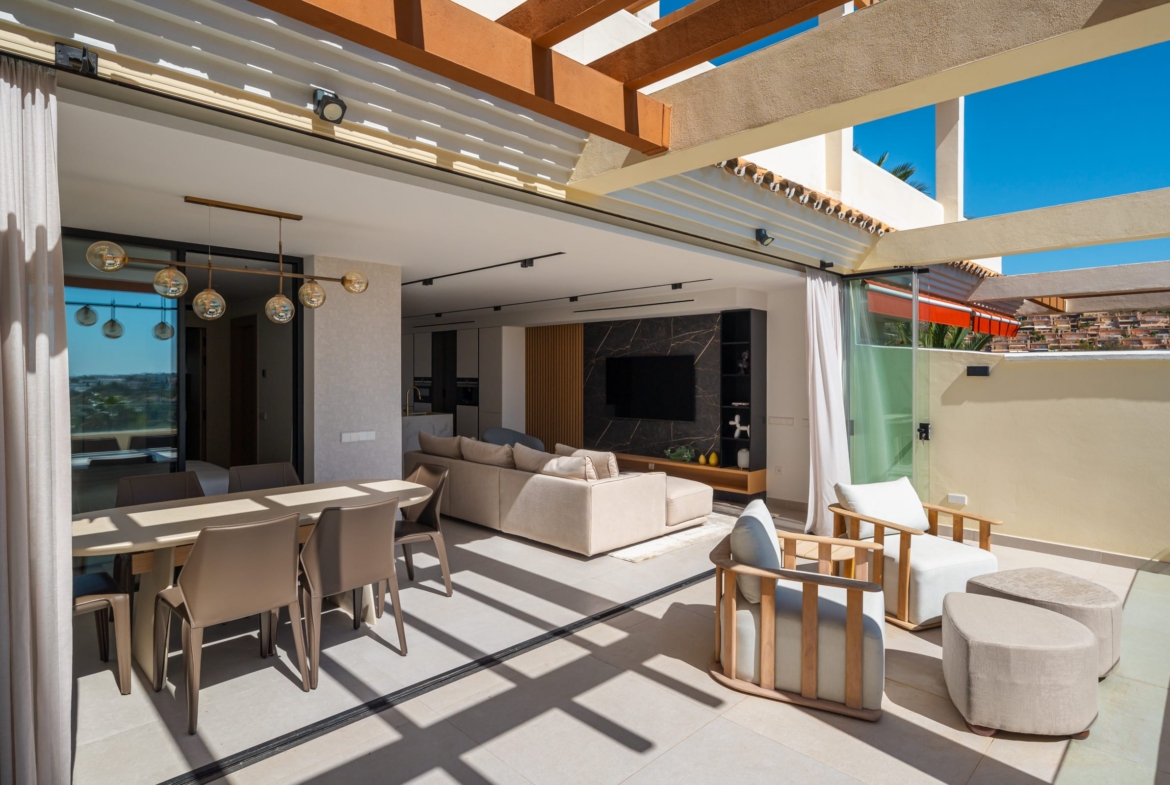 Originally built in 2003 and completely modernised in 2024, this southeast-facing apartment spans 170 m², featuring 146 m² of interior space and a 24 m² private terrace with panoramic vistas of La Concha Mountain, the Mediterranean Sea, and a serene lake.