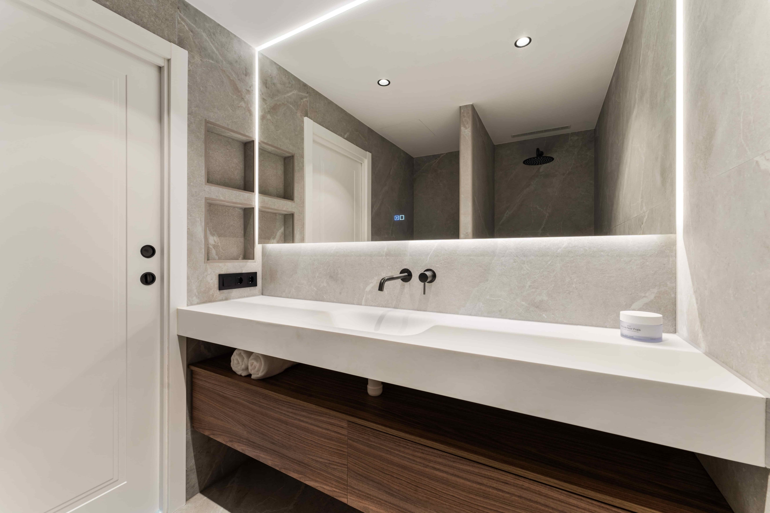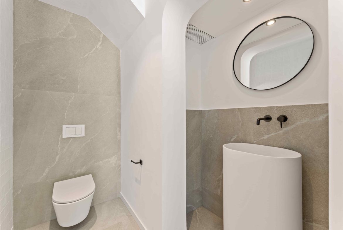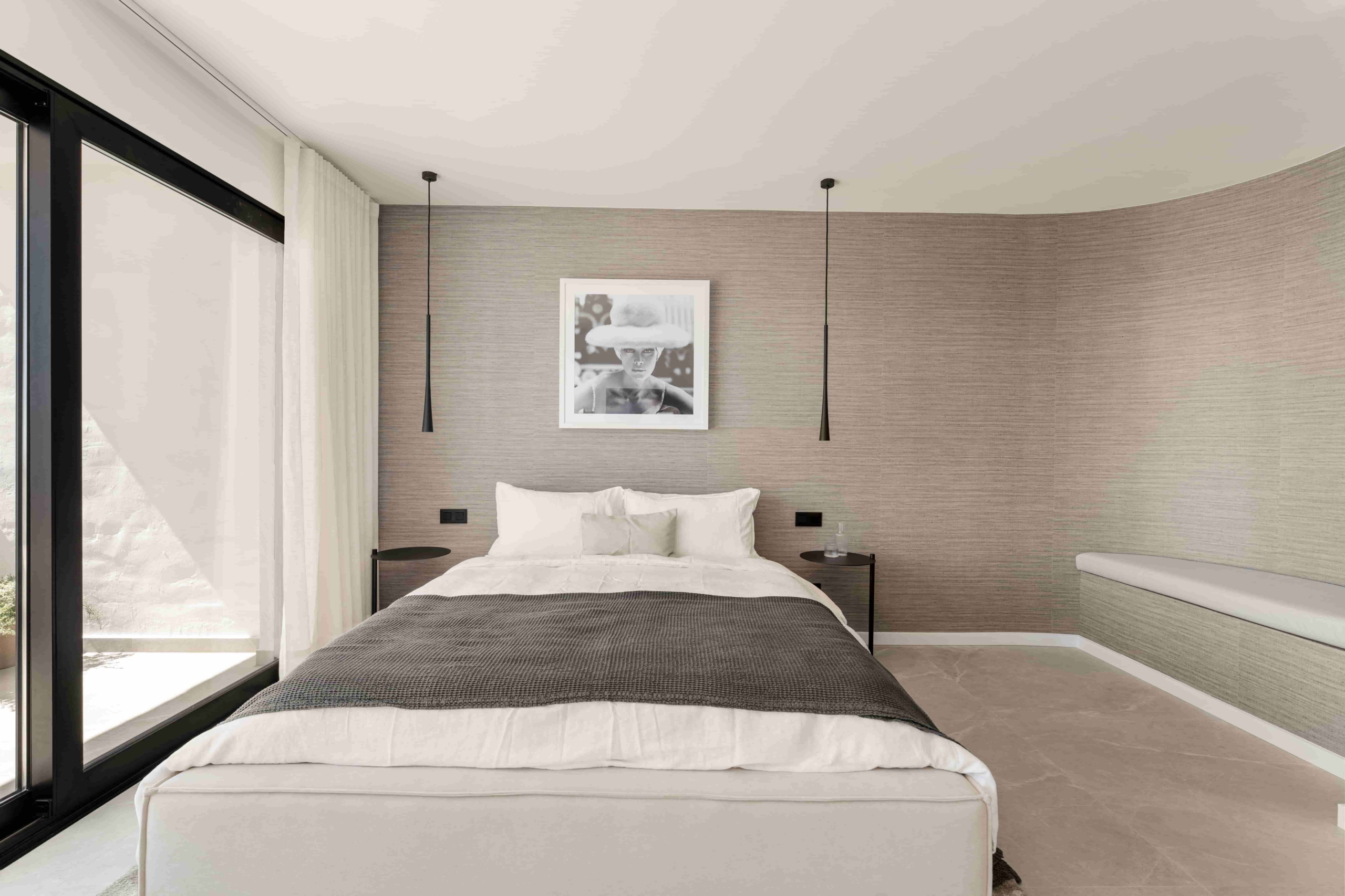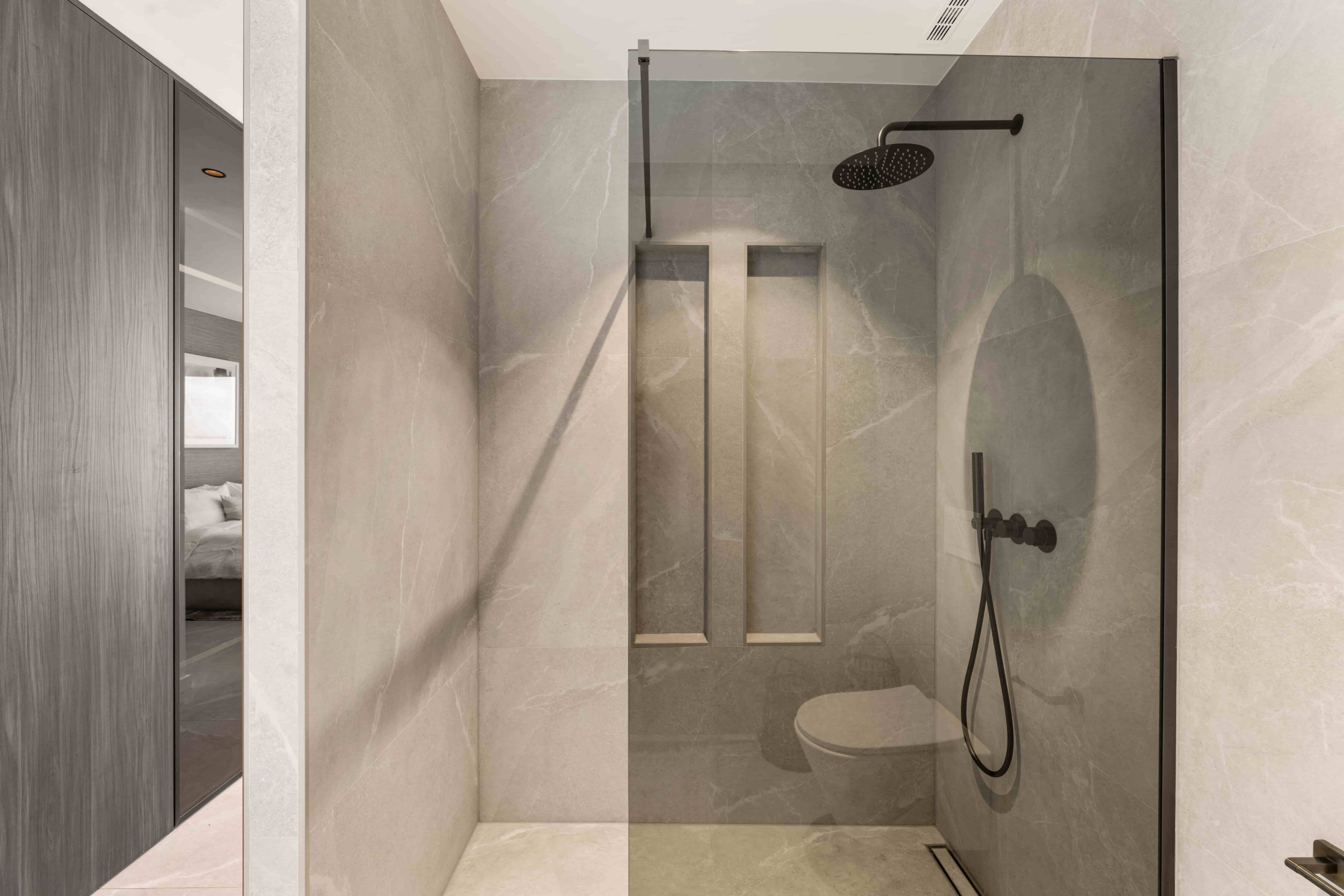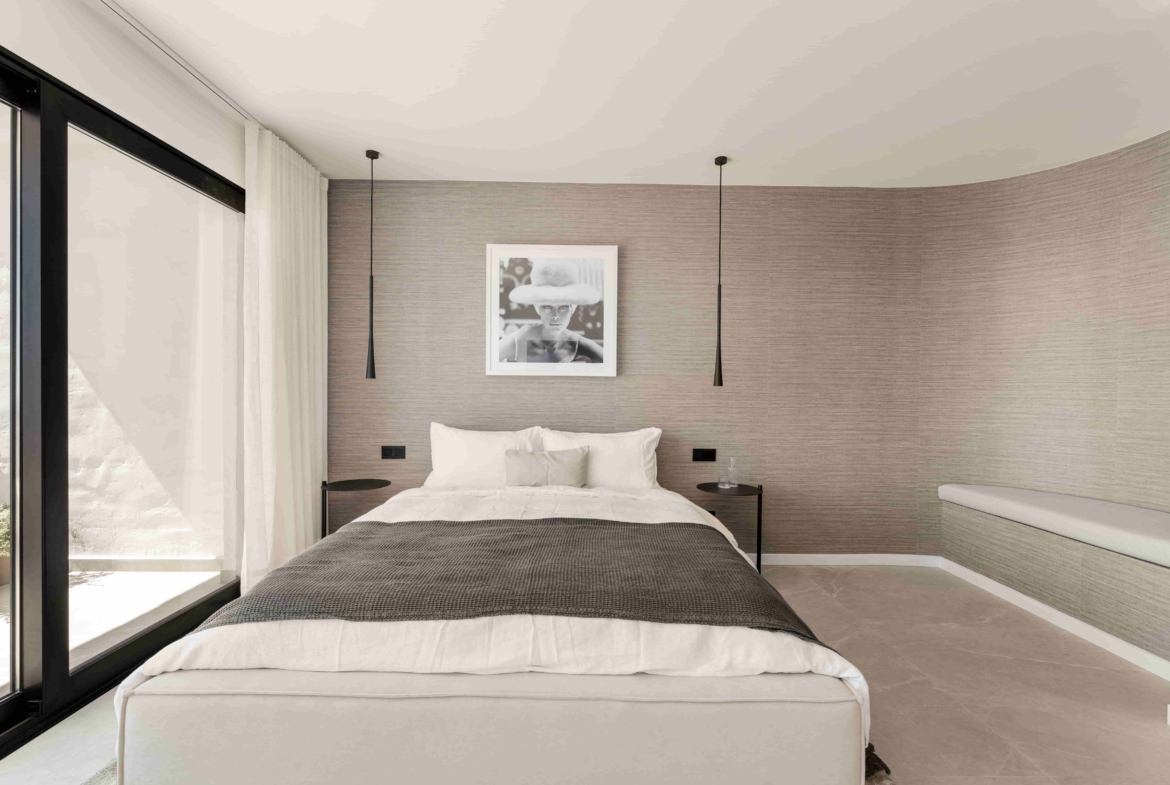 Upstairs, the three bedrooms each benefit from en-suite bathrooms and private terrace access, offering serene outdoor spaces with panoramic views of the Mediterranean Sea and mountain backdrop. The master suite stands out for its size, refined décor, and direct access to a larger terrace — the ideal setting for morning coffee or sunset views.