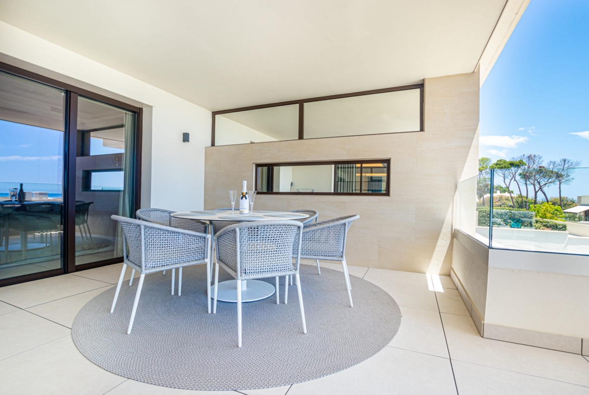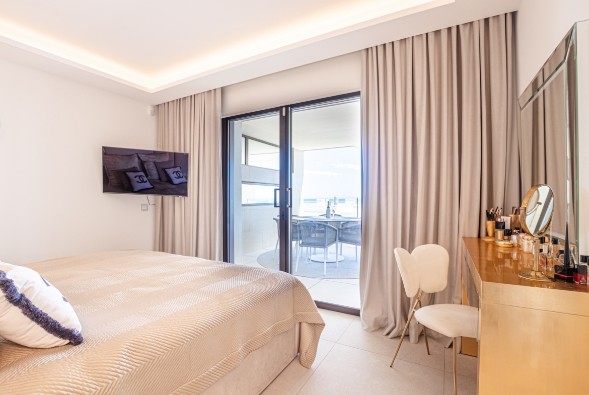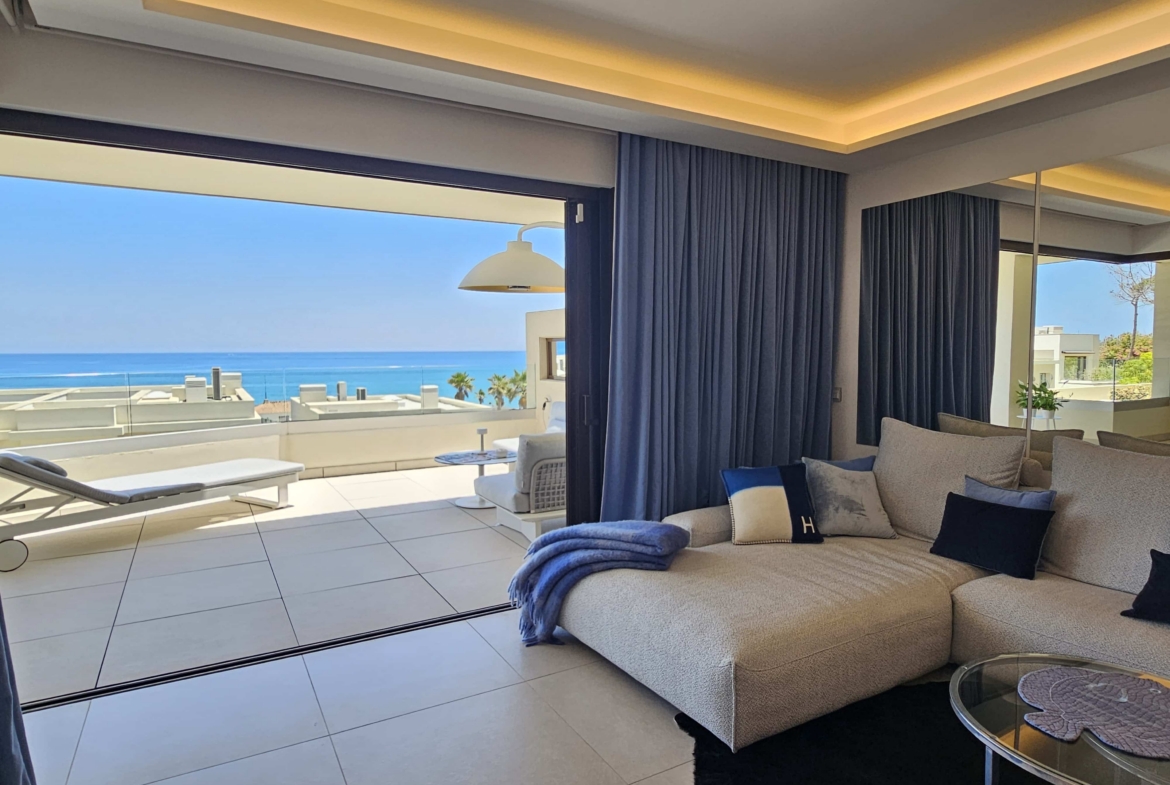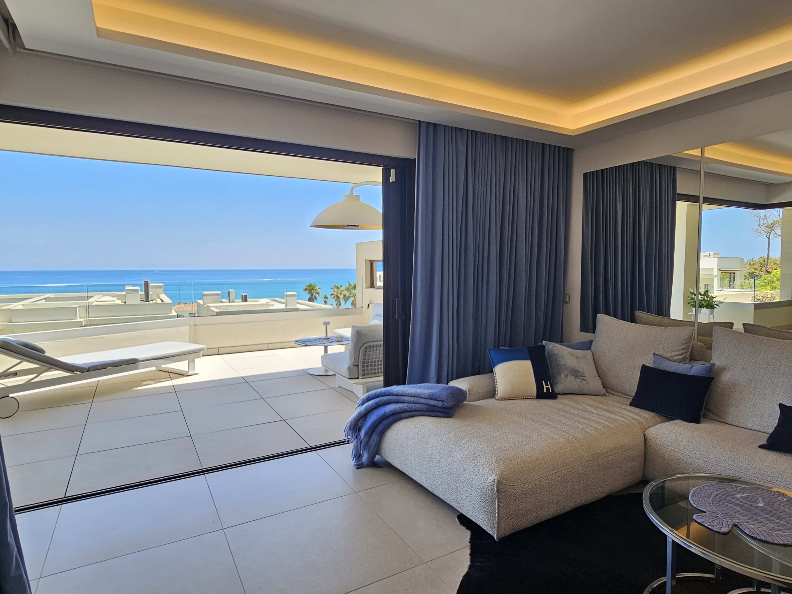 This is a perfect apartment by the sea, consisting of 2 bedrooms and 2 bathrooms, an open kitchen with an island, and a salon from where you can enjoy a magnificent view of the Mediterranean Sea. The sitting area and the master bedroom are connected to the 40m2 covered terrace. The apartment is located on the 1 floor, south facing. There is an underground garage and store room.