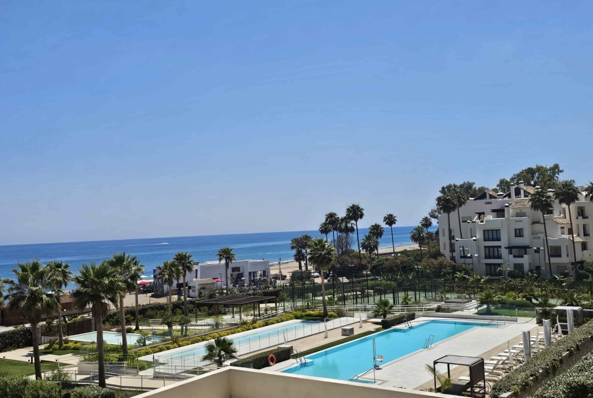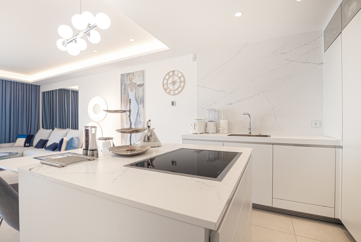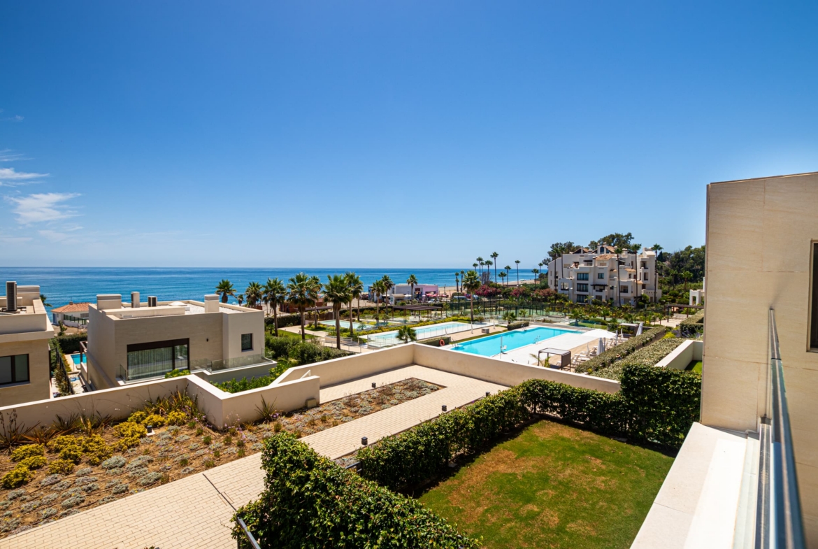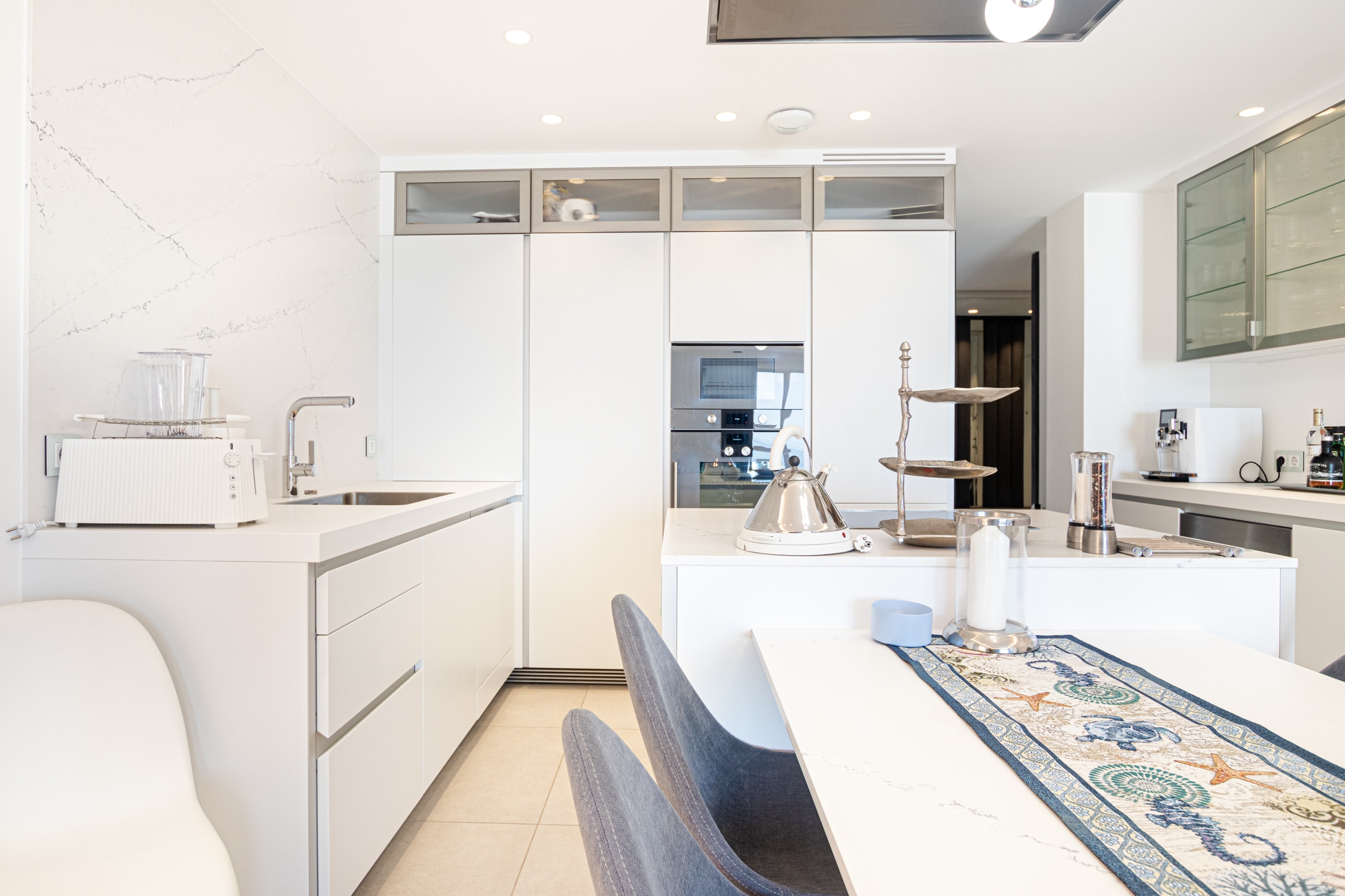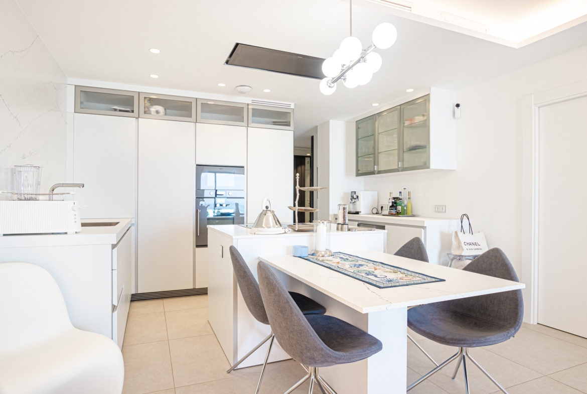This is a perfect apartment by the sea, consisting of 2 bedrooms and 2 bathrooms, an open kitchen with an island, and a salon from where you can enjoy a magnificent view of the Mediterranean Sea. The sitting area and the master bedroom are connected to the 40m2 covered terrace. The apartment is located on the 1 floor, south facing. There is an underground garage and store room.
